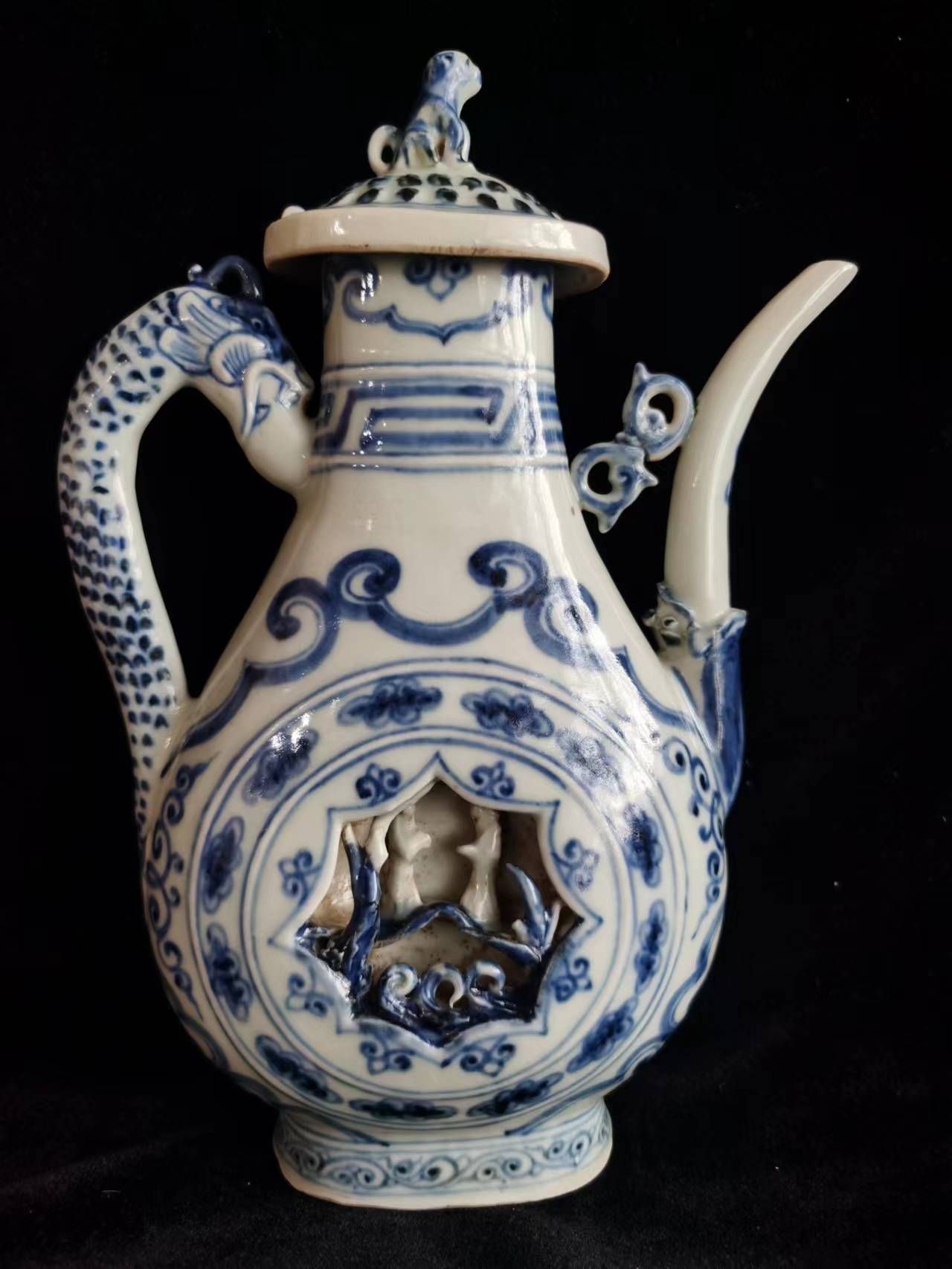Blue and White glazed pot with three dimension character sculpt
